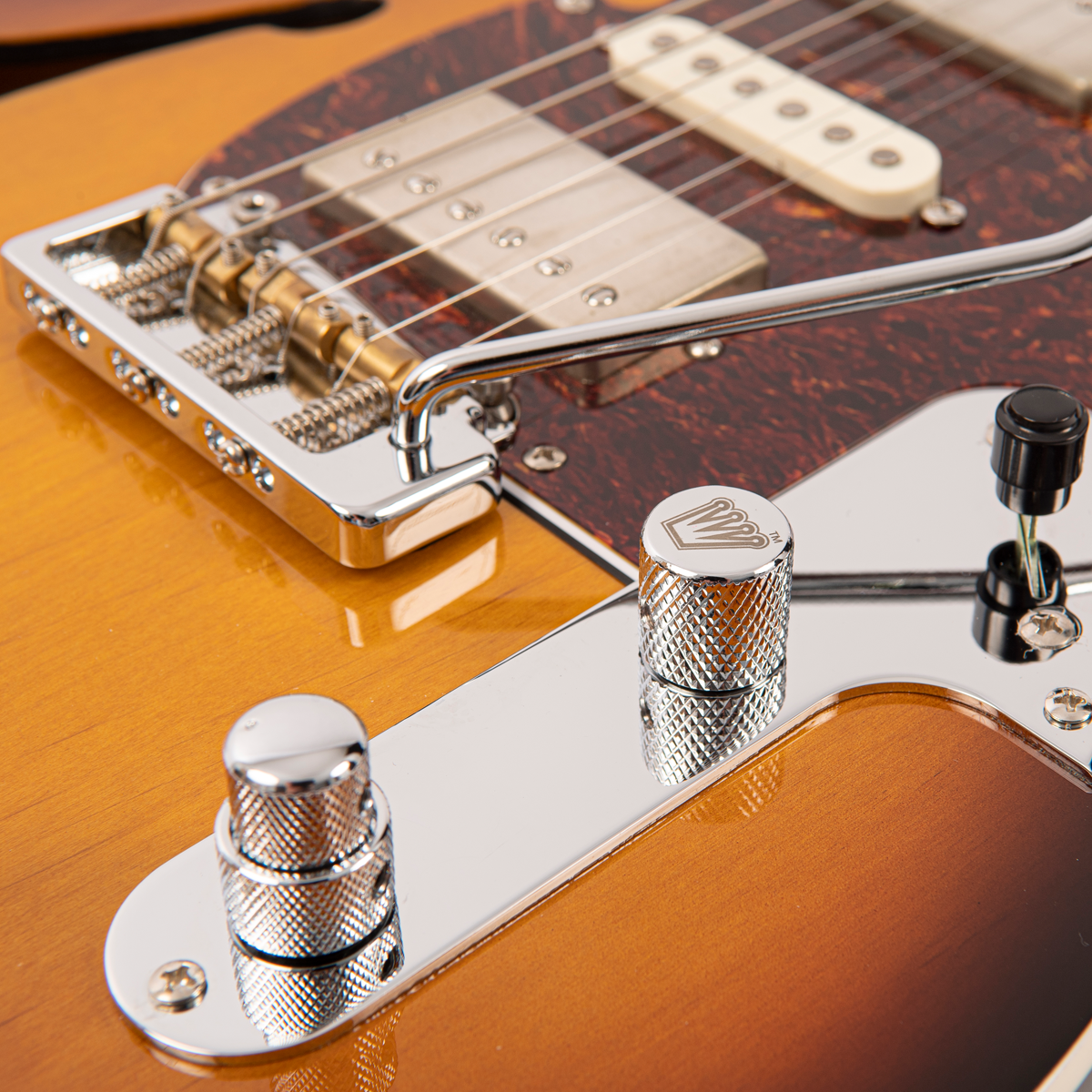 In line with Fret-King’s philosophy of thoughtful innovation, the Semitone De Luxe is loaded with a visually striking, and tonally diverse set of Fret-King pickups which deliver a phenomenal range of tones. The custom designed Fret-King neck position Alnico V Focusfield™ mini double coil pickups, created by Trev Wilkinson, speak authoratively, with a clearly defined focus, authentic tonality, depth and power. In the mid position Fret-King Dallas Special™ hot single coil is redolent of the outer edge of the single coil pickup voice, feeding in power with great dynamic control. The trio is completed by the bridge mounted Powertwin™ a hot double coil of immense capability.